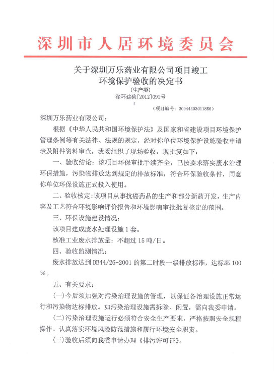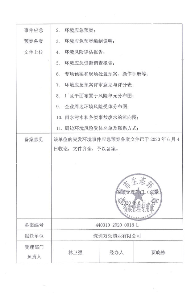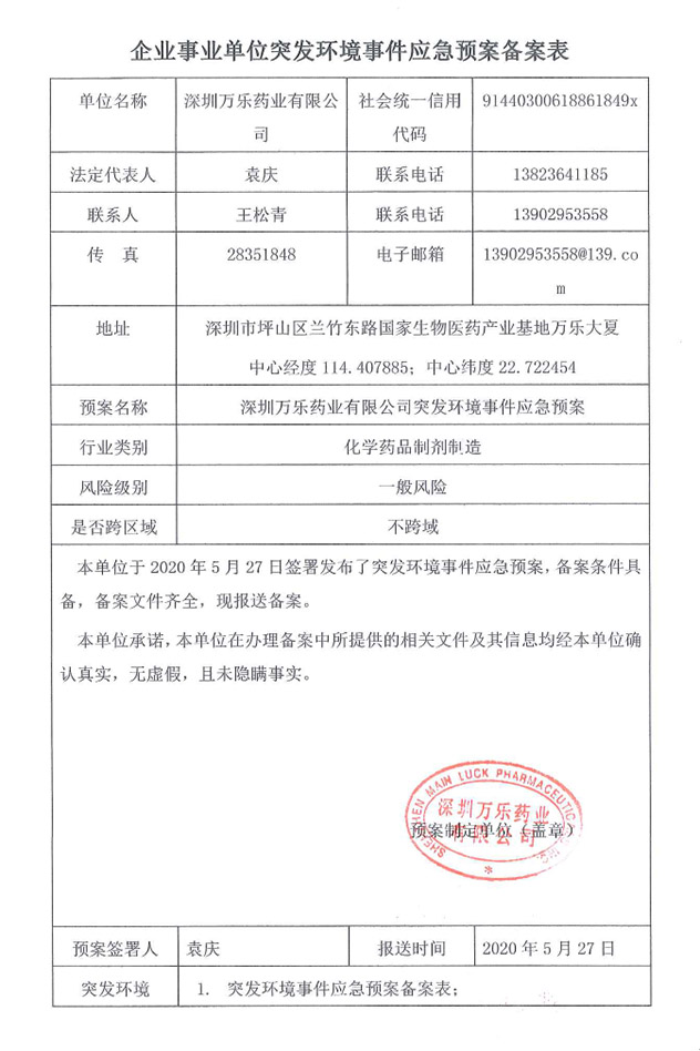 深圳万乐药业有限公司废水突发环境事件现场处置方案: