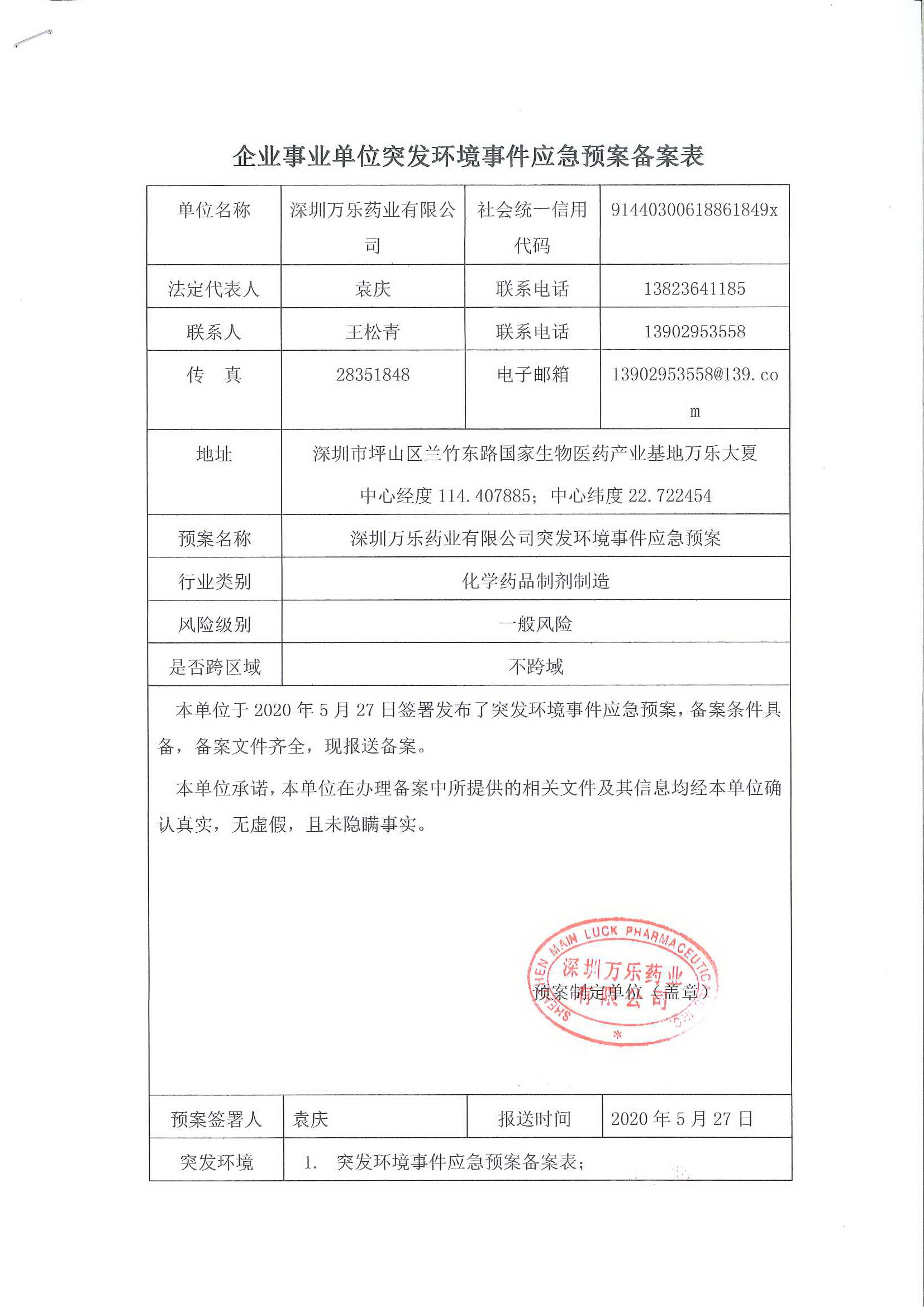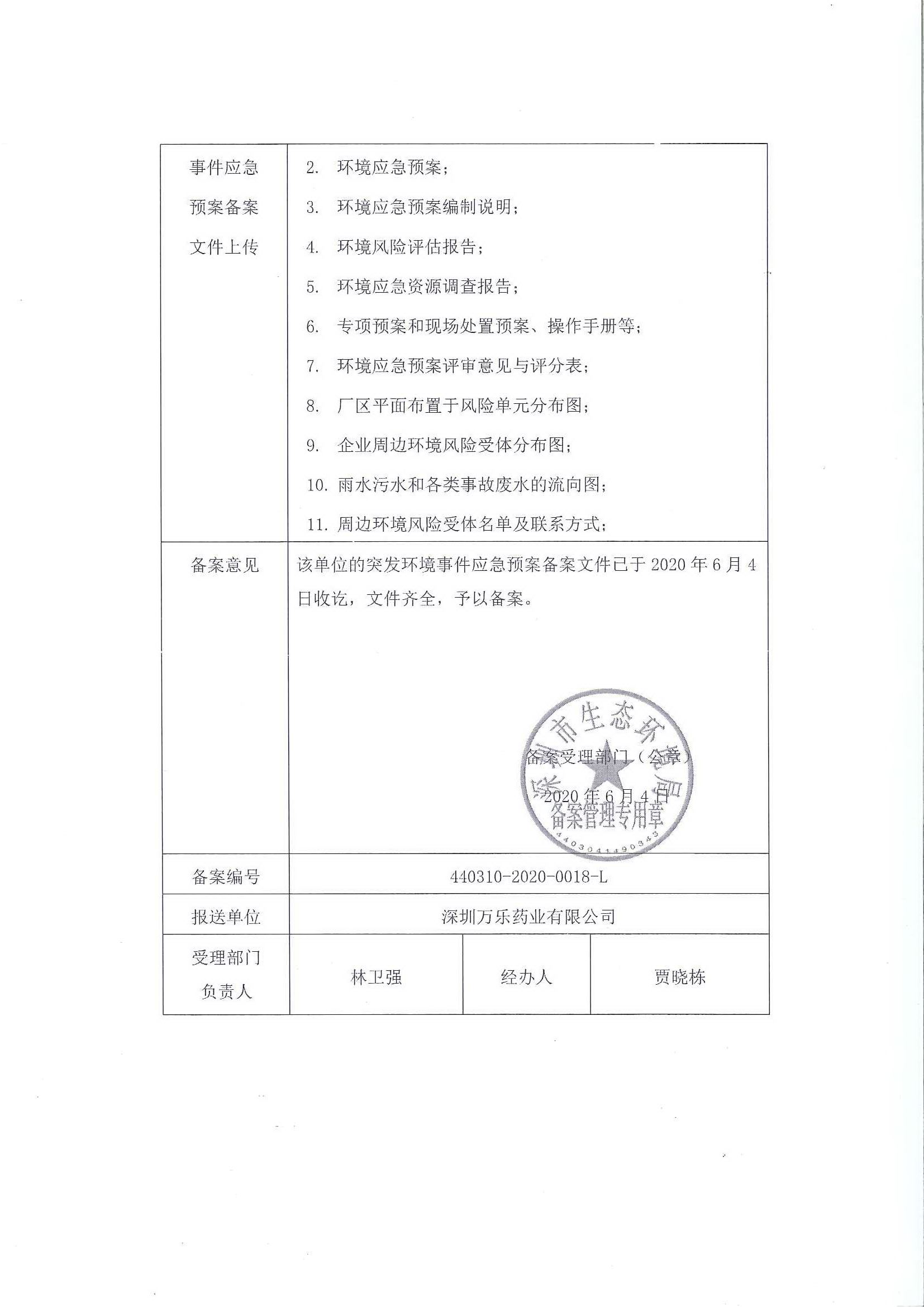 万乐药业《突发环境事件应急预案备案表》